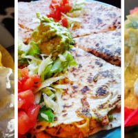 A blend of cheddar and monterey jack, onion, tomato, green chile grilled between two flour tortillas, garnished with lettuce, guacamole, diced tomatoes and sour cream